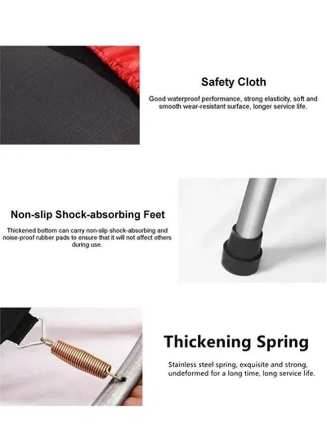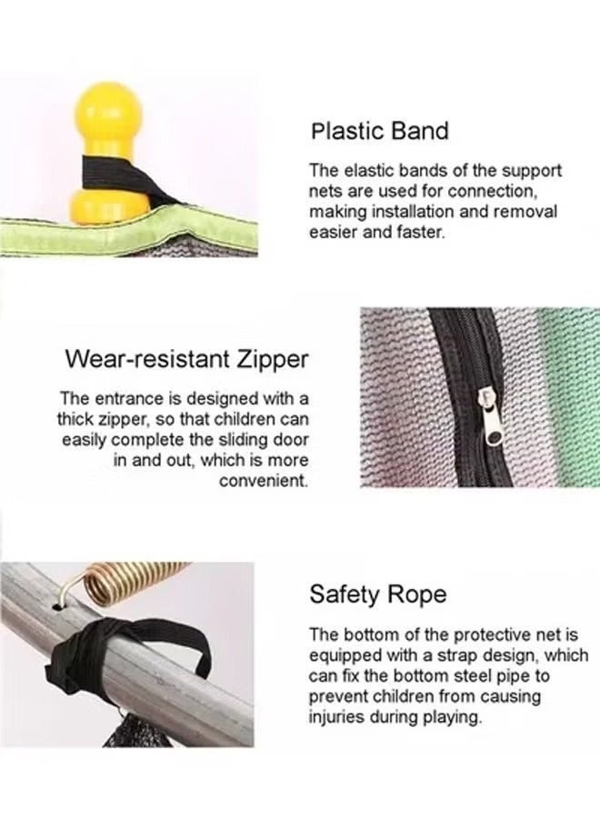 يتميز الترامبولين بستة قضبان محمية بطبقة رغوية وشبكة أمان ناعمة تحيط به بزاوية 360 درجة، لتوفير حماية شاملة أثناء اللعب. الإطار مصنوع من الفولاذ المجلفن، مع وصلات معززة على شكل حرف T لضمان ثبات الترامبولين وأمان الأطفال أثناء القفز. كما يضم بابًا بسحاب لسهولة الدخول والخروج مع ضمان السلامة.