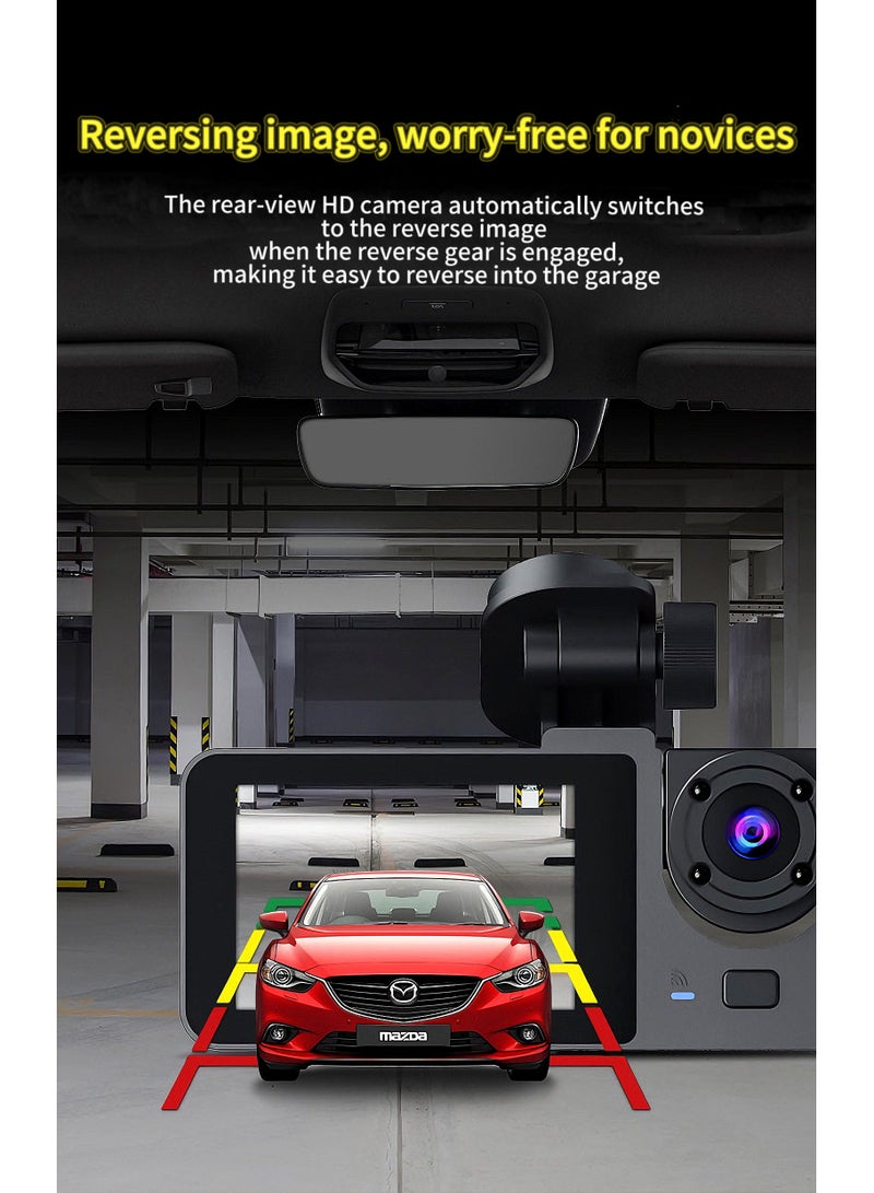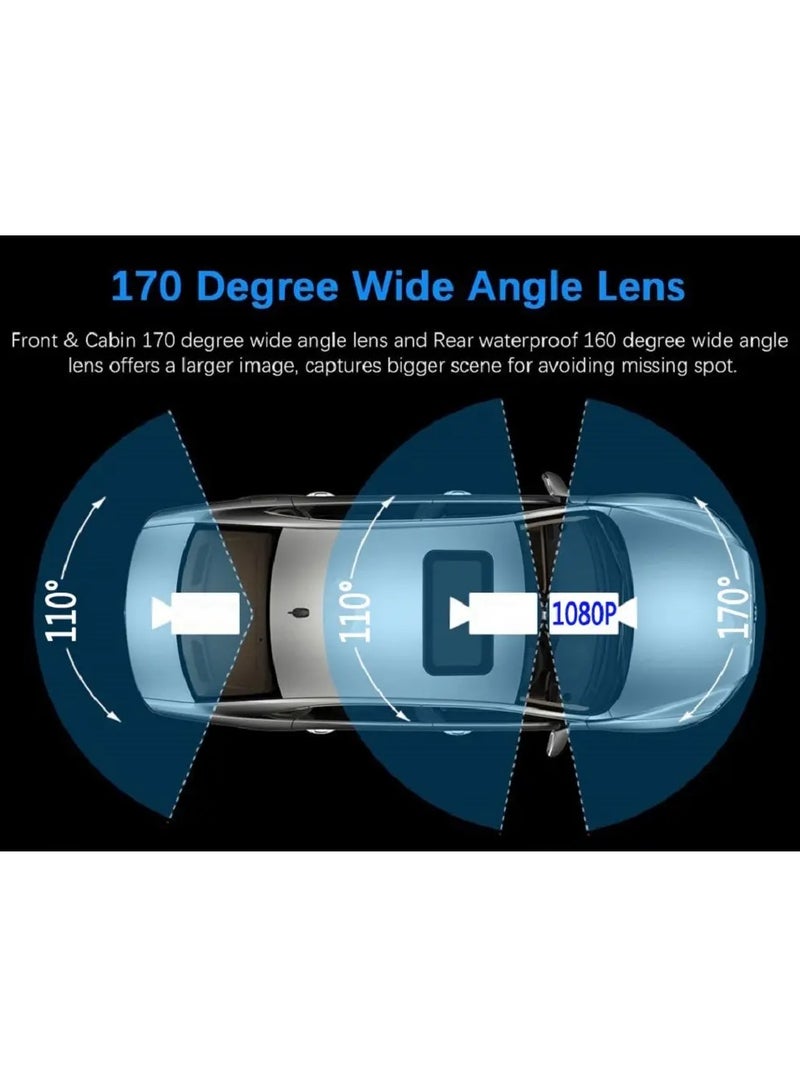 - 360° Dash Cams Front and Rear: 3 Channel dashcam built in 170° + 110° + 140° wide viewing angle lens to cover front, cabin and rear road view simultaneously, ensuring high-definition recording; The 170 ° ultra wide angle can cover 6 lanes, effectiv
